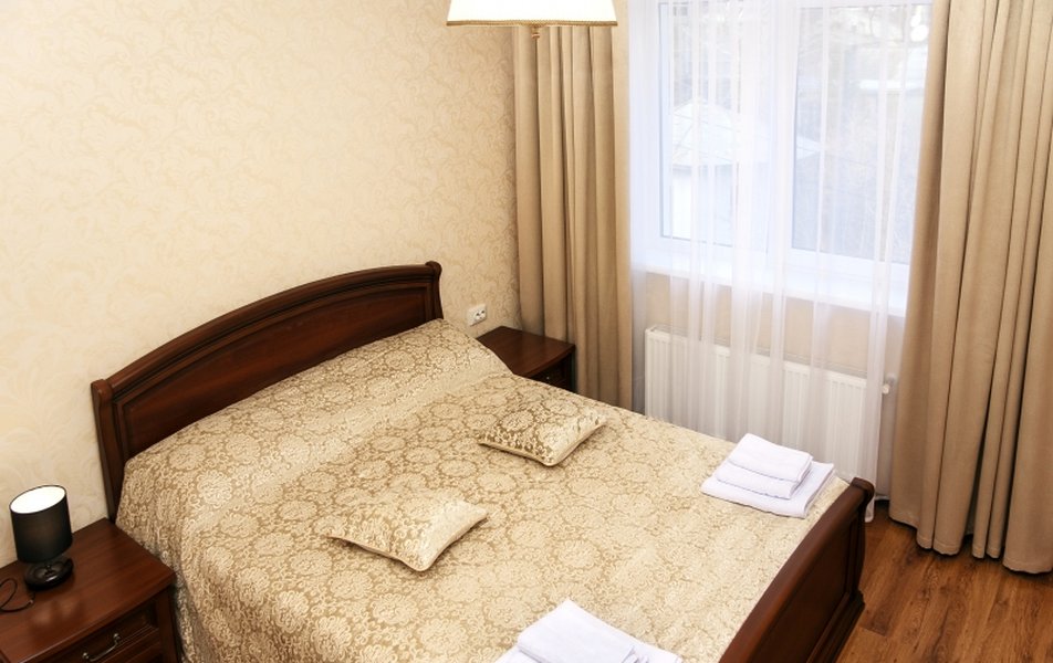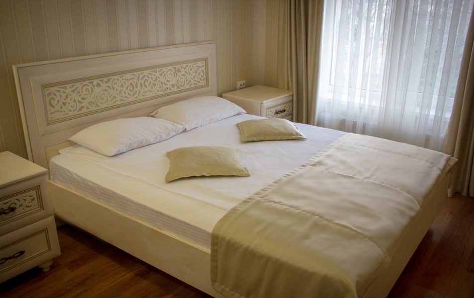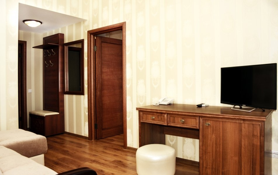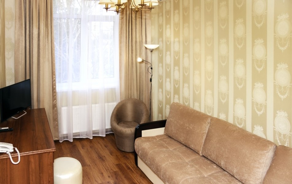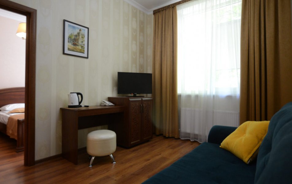 Полулюкс 2-местный 2-комнатный Количество комнат: 1-комнатный Тип номера: Полулюкс Кол-во основных мест: 2 Площадь (кв. м): 24 Мебель: вешалка, диван, зеркало, кровать двуспальная, прикроватные тумбочки, стол, стулья, шкаф Оборудование: кондиционер, телевизор, холодильник, электрочайник Санузел: с душем, туалетные принадлежности, фен Сервис: Wi-Fi бесплатно, смена полотенец, смена постельного белья, уборка номера