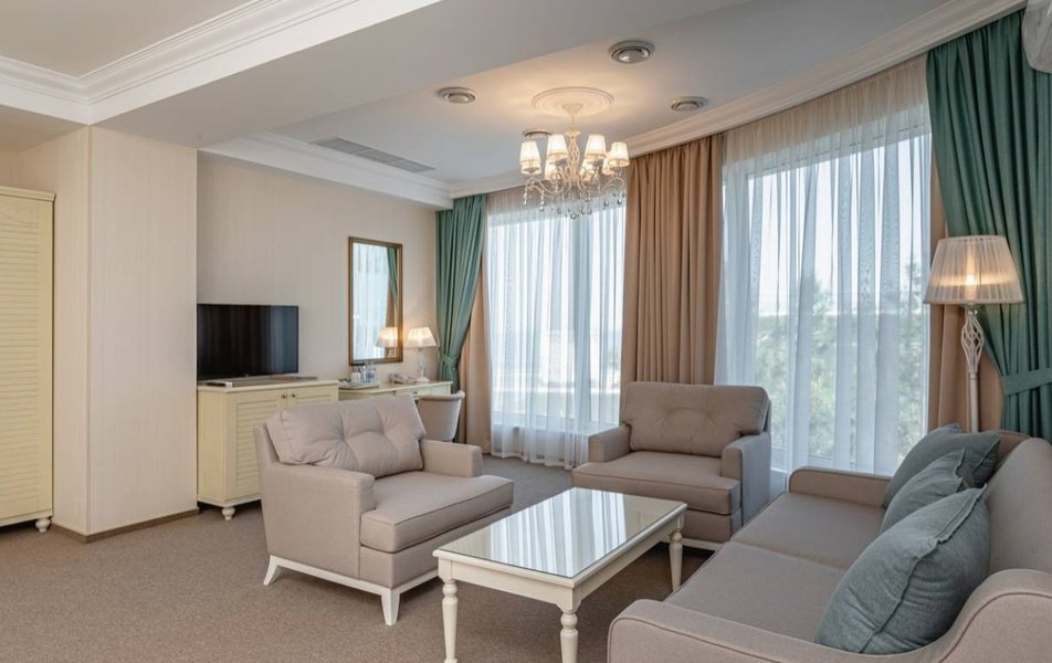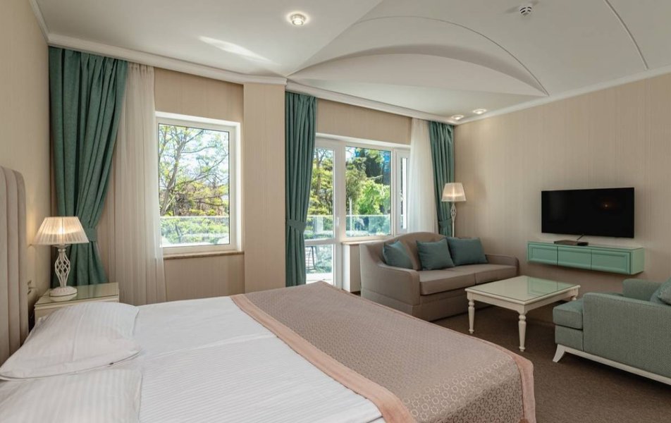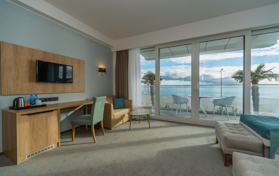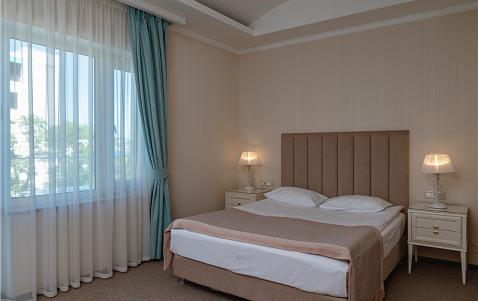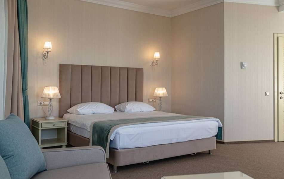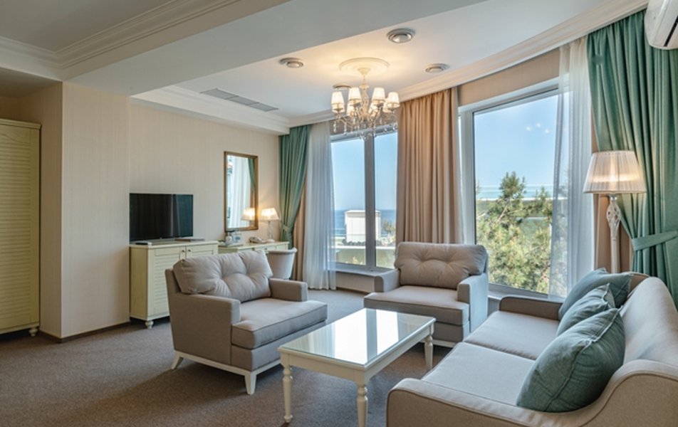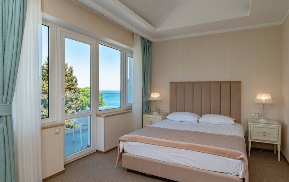 Отдыхали в отеле по многочисленным рекомендациям знакомых, прекрасное расположение: первая линия, вид на море из комплекса «Лето», променад по Приморскому пляжу в центр, хороший спа-комплекс с бассейном. С парковкой пришлось потрудиться, количество мест ограничено, приходится располагать подальше авто. Не слишком очевидна навигация по комплексу. В комплексе «Лето» новый ремонт, имеется лифт, вежливый персонал. Нлмер категории «Делюкс» довольно просторный, великолепный вид на море, балкон с мебелью, ТВ, холодильник, кондиционер, фен, чайник, чайный набор, вода по 0,5л, косметика, тапочки.Большой спа-комплекс с разнообразными парными, крытым и открытым бассейном. В летнее время работают спасатели на пляже, пляж благоустроенный лежаками, зонтами и полотенцами для гостей отеля. В качестве презента имениннику дарят бутылку шампанского. Завтраки проходят в ресторане «Фабрикант» по системе «шведская линия», разнообразный выбор блюд и напитков. Столики как внутри, так и на веранде, утопающий в зелени с красивым видом на море. Территория отеля хорошо благоустроена, разные виды растений и деревьев, из отеля напрямую можно выйти на набережную и в Приморский парк. В отеле круглый год действуют скидки при бронировании через сайт отеля. Рекомендую отель для отдыха!