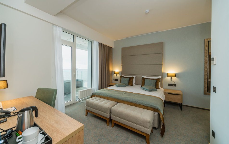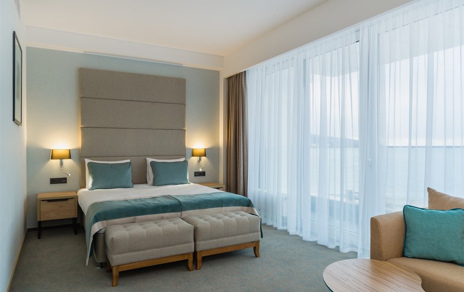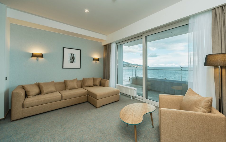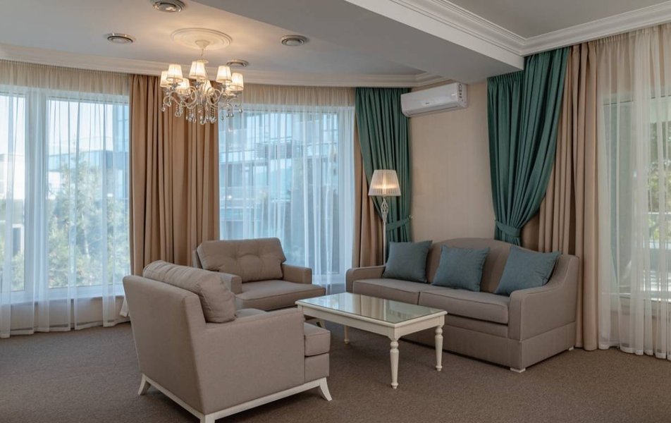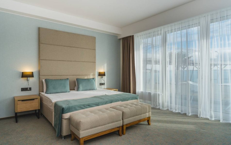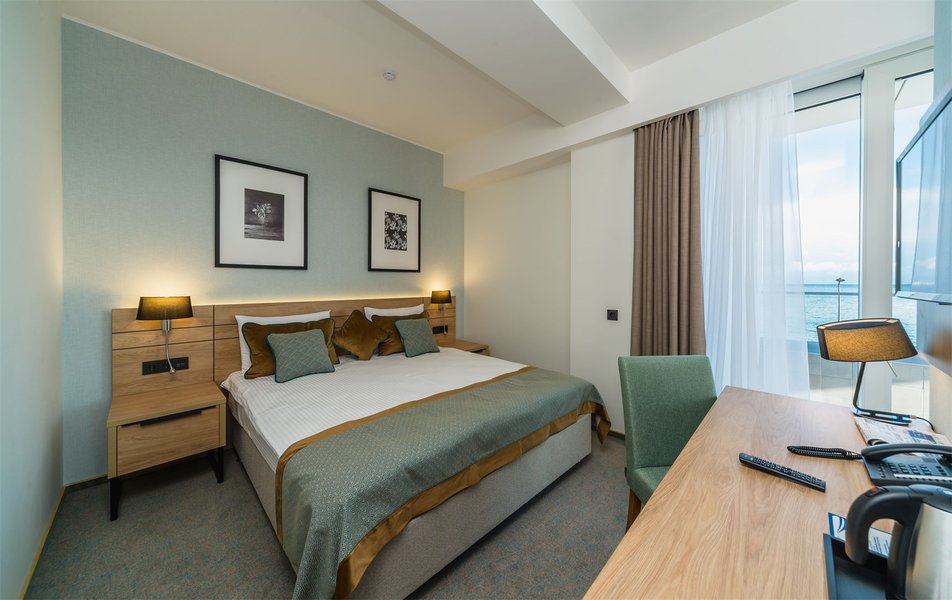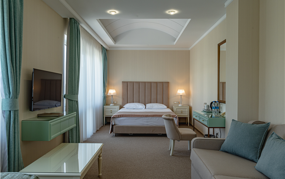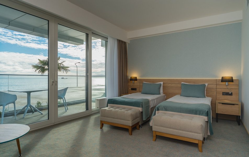 Отдыхали в отеле по многочисленным рекомендациям знакомых, прекрасное расположение: первая линия, вид на море из комплекса «Лето», променад по Приморскому пляжу в центр, хороший спа-комплекс с бассейном. С парковкой пришлось потрудиться, количество мест ограничено, приходится располагать подальше авто. Не слишком очевидна навигация по комплексу. В комплексе «Лето» новый ремонт, имеется лифт, вежливый персонал. Нлмер категории «Делюкс» довольно просторный, великолепный вид на море, балкон с мебелью, ТВ, холодильник, кондиционер, фен, чайник, чайный набор, вода по 0,5л, косметика, тапочки.Большой спа-комплекс с разнообразными парными, крытым и открытым бассейном. В летнее время работают спасатели на пляже, пляж благоустроенный лежаками, зонтами и полотенцами для гостей отеля. В качестве презента имениннику дарят бутылку шампанского. Завтраки проходят в ресторане «Фабрикант» по системе «шведская линия», разнообразный выбор блюд и напитков. Столики как внутри, так и на веранде, утопающий в зелени с красивым видом на море. Территория отеля хорошо благоустроена, разные виды растений и деревьев, из отеля напрямую можно выйти на набережную и в Приморский парк. В отеле круглый год действуют скидки при бронировании через сайт отеля. Рекомендую отель для отдыха!
