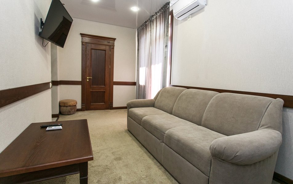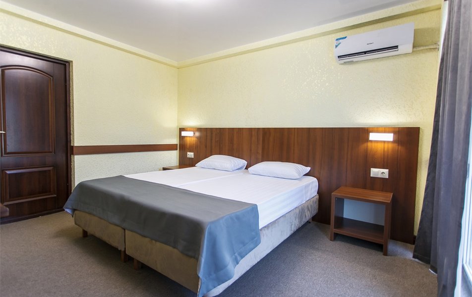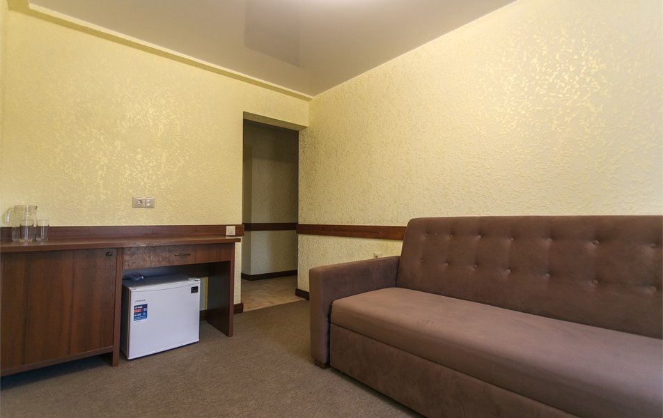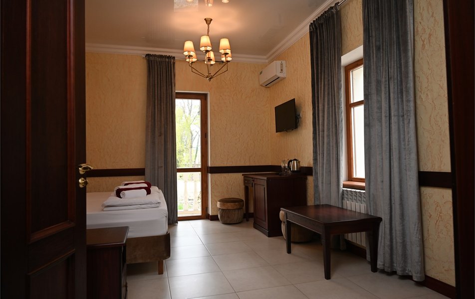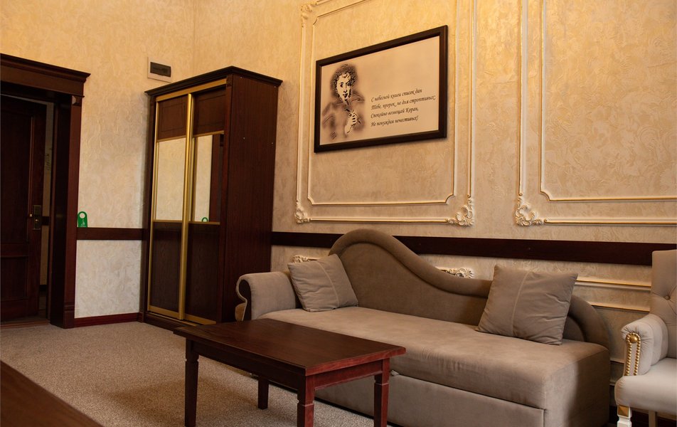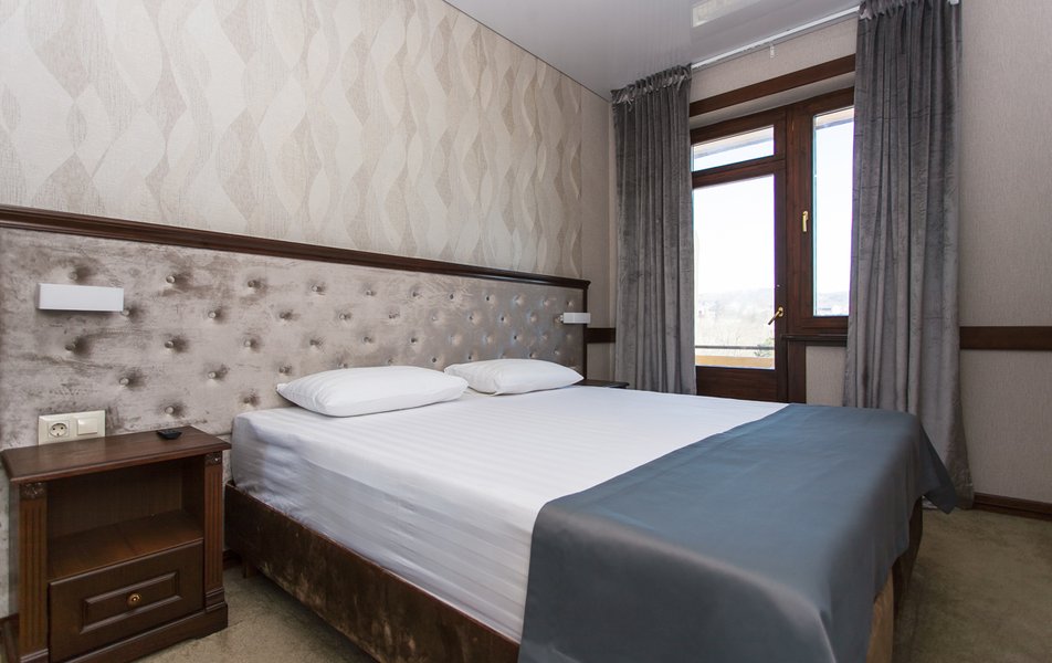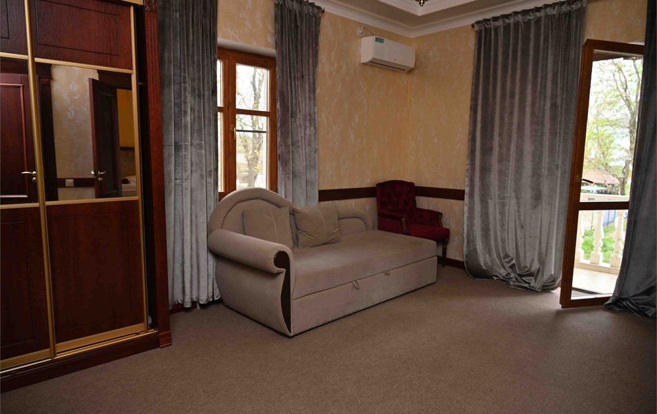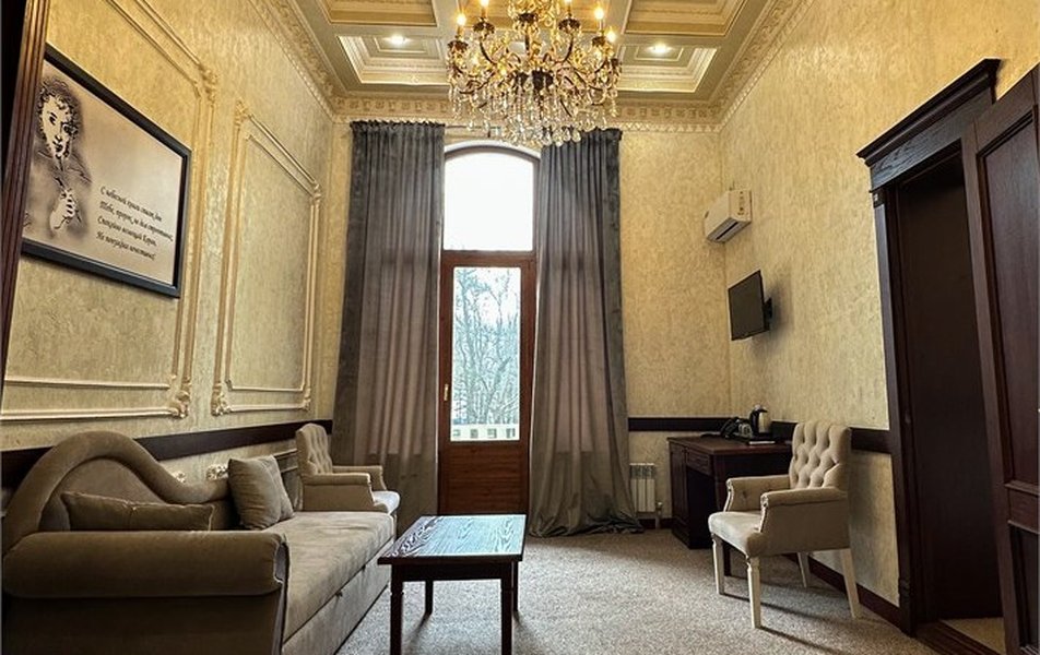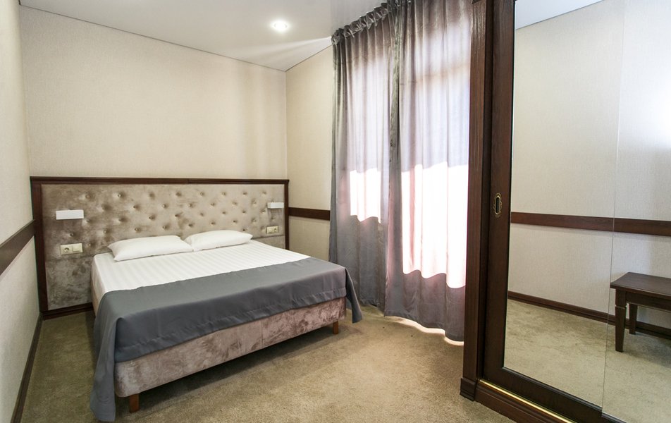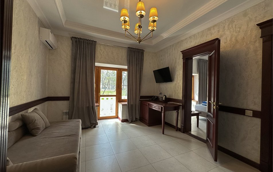 Апартаменты 3-местный 2-комнатный (Видовой, корпус «Пушкино») Количество комнат: 2-комнатный Тип номера: Апартаменты Дополнительное место: диван, еврораскладушка Вид из номера: на парк Кол-во доп. мест: 2 Кол-во основных мест: 3 Корпус: Пушкино Площадь (кв. м): 27 Мебель: вешалка, диван раскладной, зеркало, кровать двуспальная, прикроватные тумбочки, стол, столик журнальный, стулья, шкаф Оборудование: мини-холодильник, сплит-система, телевизор, телефон, чайная станция Санузел: с ванной, тапочки, туалетные принадлежности, фен, халат Сервис: Wi-Fi бесплатно, смена полотенец, смена постельного белья, уборка номера, услуги внутренней телефонной связи