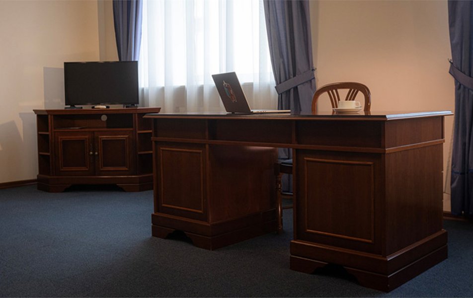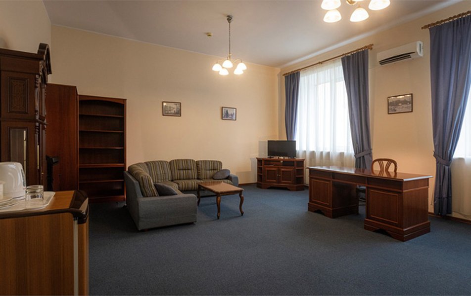 Люкс 2-местный 2-комнатный Количество комнат: 2-комнатный Тип номера: Люкс Вид из номера: на город: или во двор Кол-во основных мест: 2 Площадь (кв. м): 75 Мебель: вешалка, диван, зеркало, комод, кресла, кровать двуспальная, прикроватные тумбочки, стол, столик журнальный, стул, шкаф Оборудование: кондиционер, мини-холодильник, набор посуды, сейф, телевизор, телефон, электрочайник Санузел: с душем, тапочки, туалетные принадлежности, фен, халат Сервис: Wi-Fi бесплатно, карточная система замков, смена полотенец, смена постельного белья, уборка номера, услуги внутренней телефонной связи