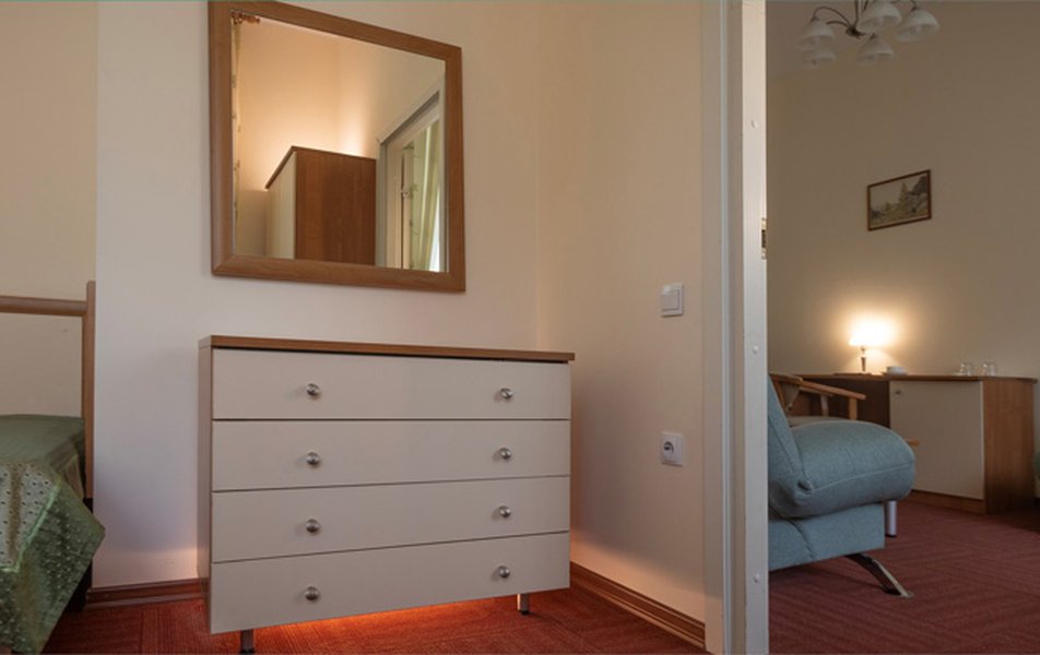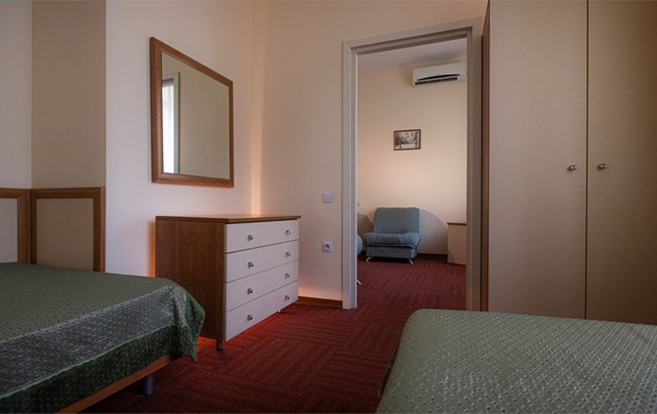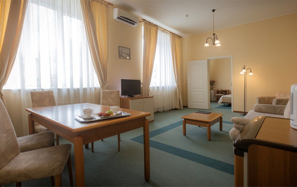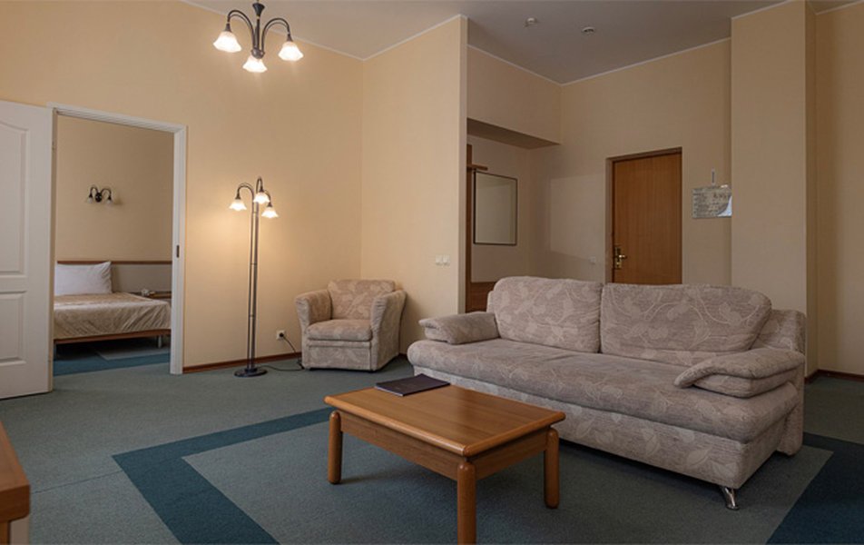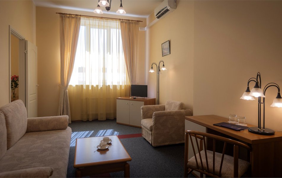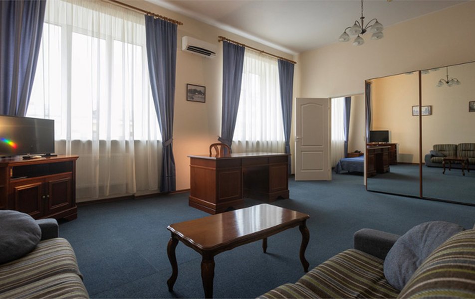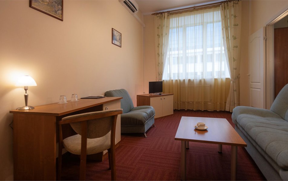 Стандартный 2-местный 2-комнатный DBL Количество комнат: 2-комнатный Тип номера: Стандартный Дополнительное место: диван Вид из номера: на город: или во двор Кол-во доп. мест: 1 Кол-во основных мест: 2 Площадь (кв. м): 40 Мебель: вешалка, диван, зеркало, комод, кресло, кровать двуспальная, прикроватные тумбочки, стол, столик журнальный, стул, шкаф Оборудование: кондиционер, мини-холодильник, набор посуды, сейф, телевизор, телефон, электрочайник Санузел: с душем, туалетные принадлежности, фен Сервис: Wi-Fi бесплатно, карточная система замков, смена полотенец, смена постельного белья, уборка номера, услуги внутренней телефонной связи
