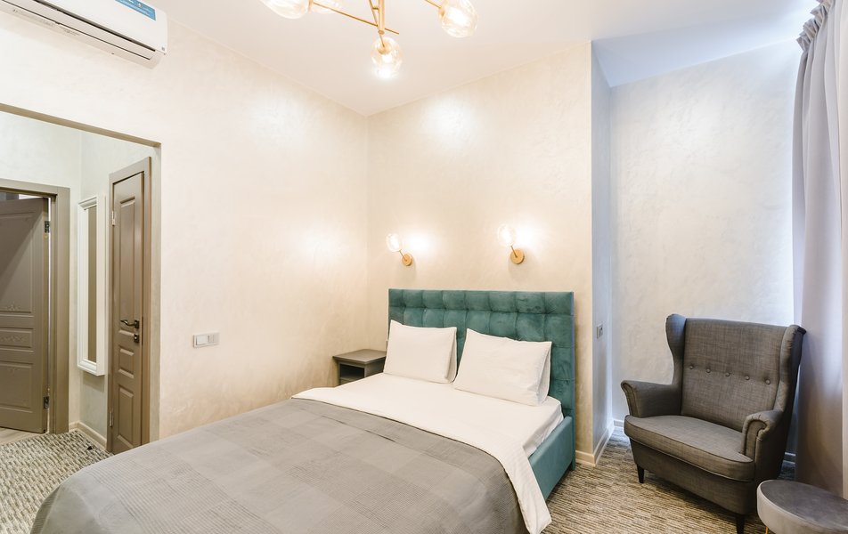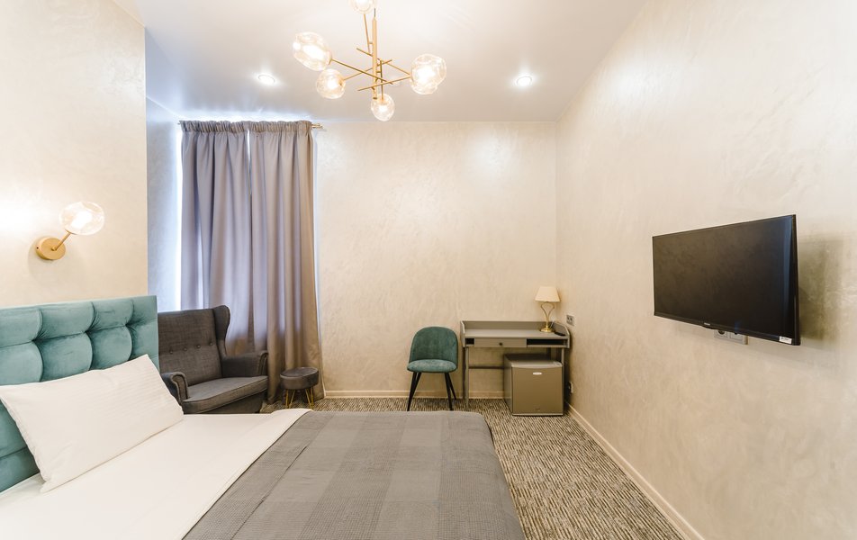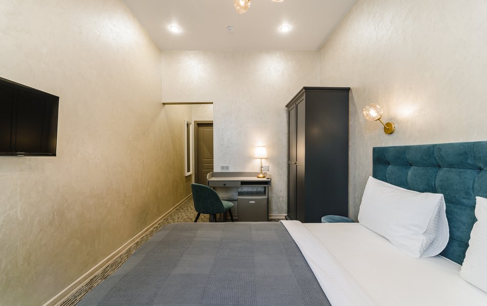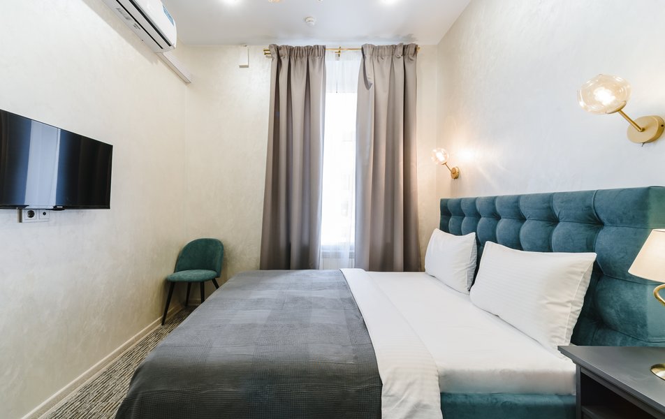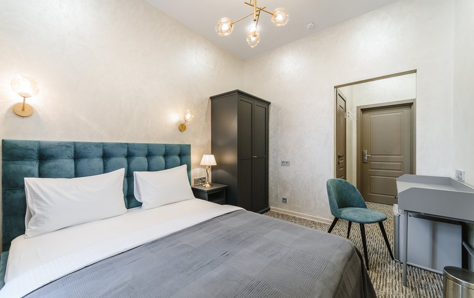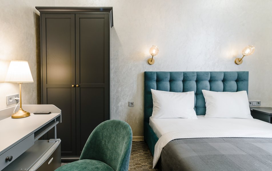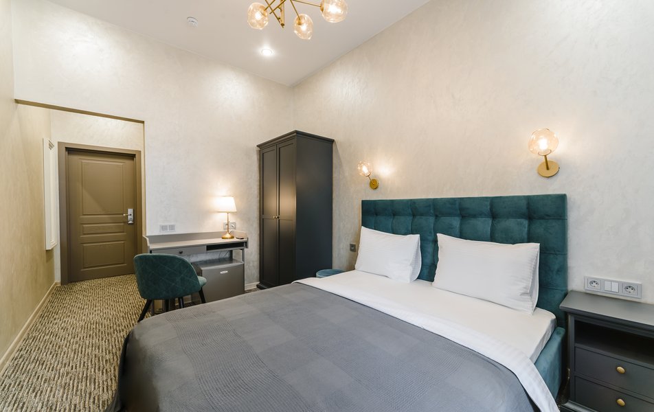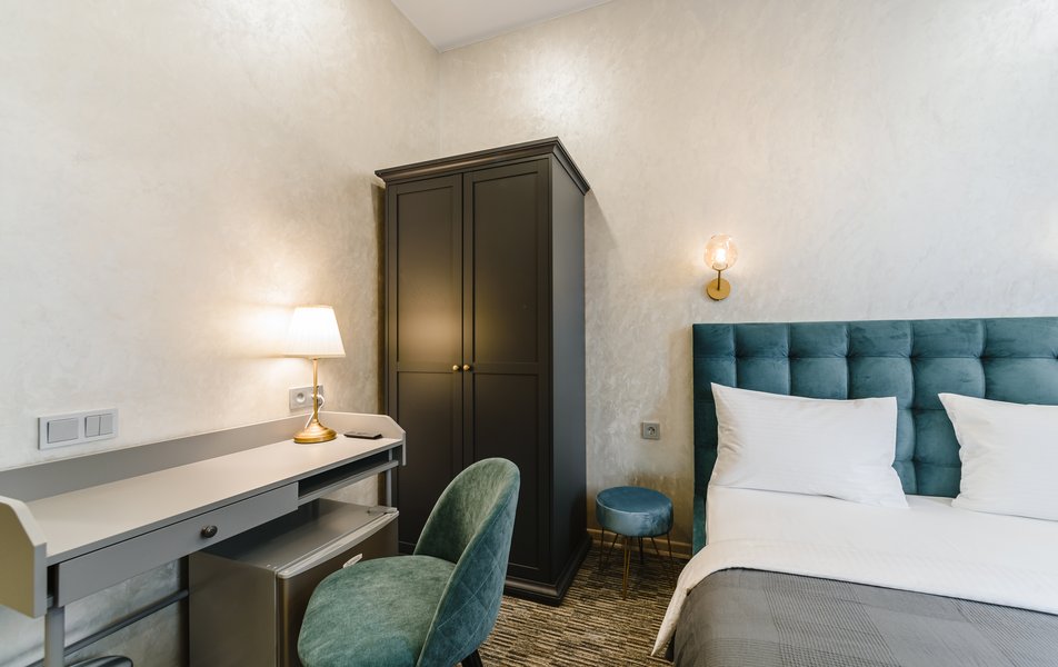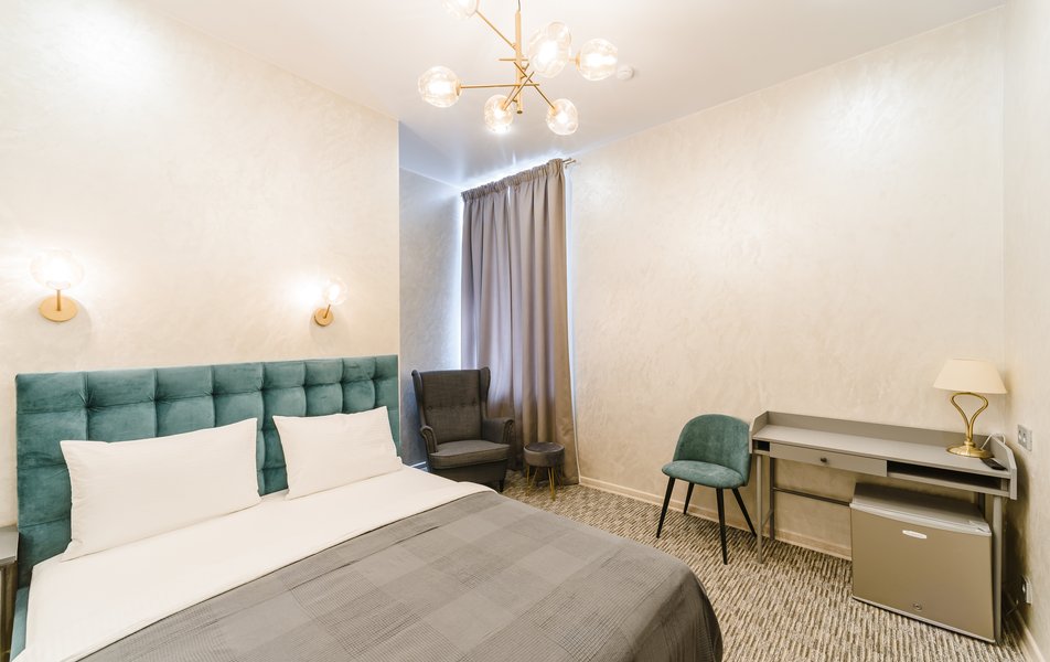 Стандартный 2-местный DBL Количество комнат: 1-комнатный Тип номера: Стандартный Вид из номера: на двор Кол-во основных мест: 2 Площадь (кв. м): 16 Мебель: вешалка, зеркало, кровать двуспальная, прикроватные тумбочки, стол, стул, шкаф Оборудование: мини-холодильник, сейф, телевизор: яндекс-ТВ с подключенным Кинопоиском Санузел: с душем, тапочки, туалетные принадлежности Сервис: Wi-Fi бесплатно