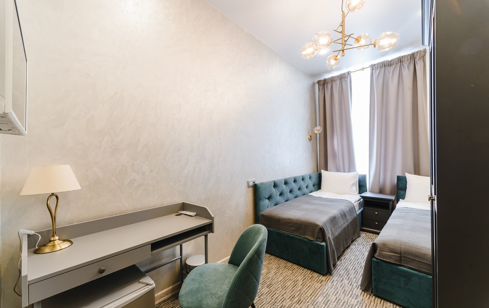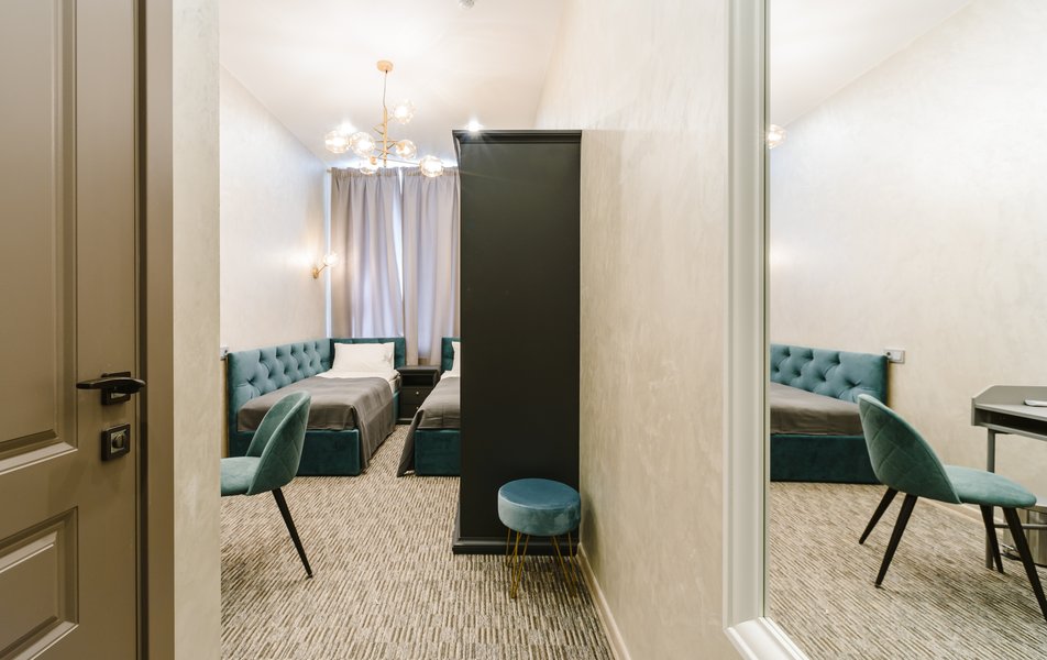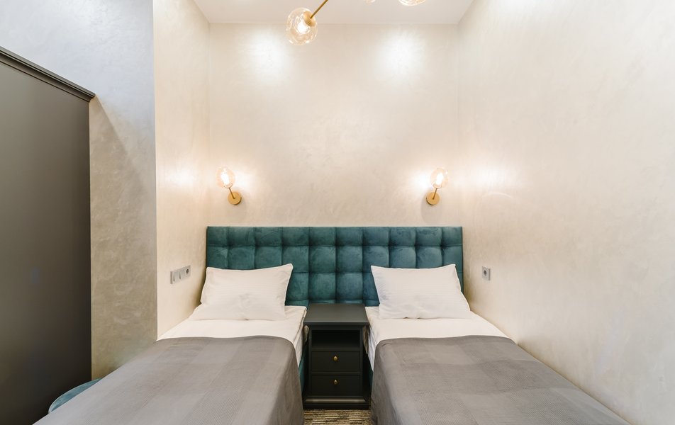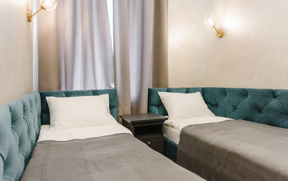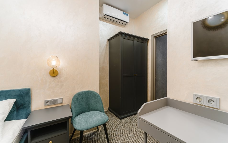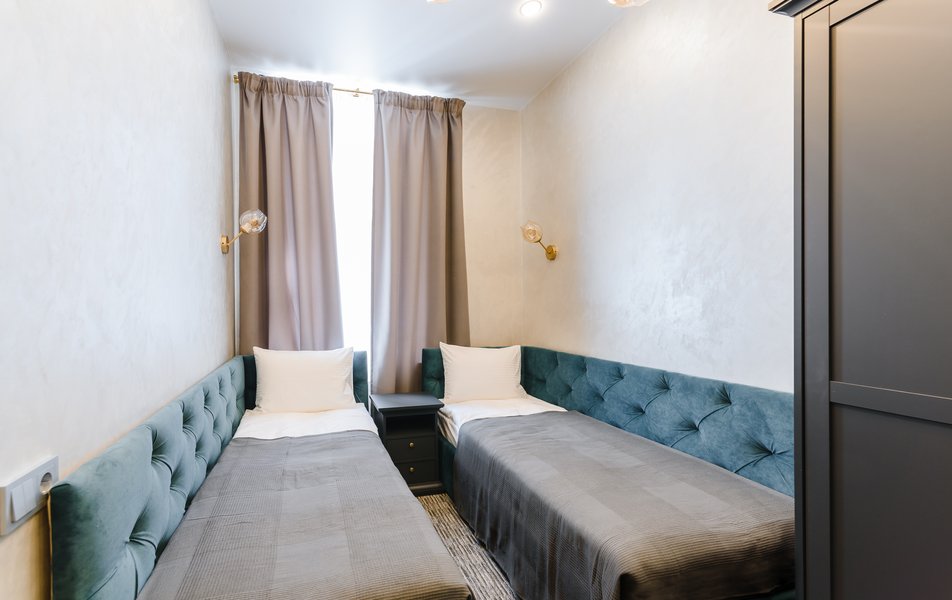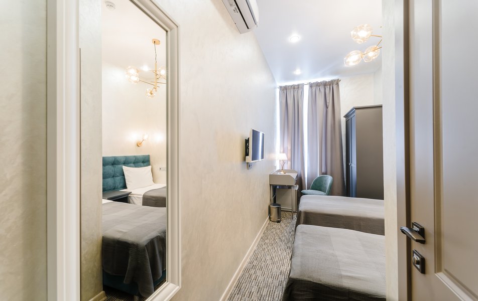 Стандартный 2-местный TWIN Количество комнат: 1-комнатный Тип номера: Стандартный Вид из номера: на город Кол-во основных мест: 2 Площадь (кв. м): 16 Мебель: вешалка, зеркало, кровати односпальные, прикроватные тумбочки, стол, стул, шкаф Оборудование: мини-холодильник, сейф, телевизор: смарт-ТВ с подключенным Кинопоиском Санузел: с душем, тапочки, туалетные принадлежности Сервис: Wi-Fi бесплатно