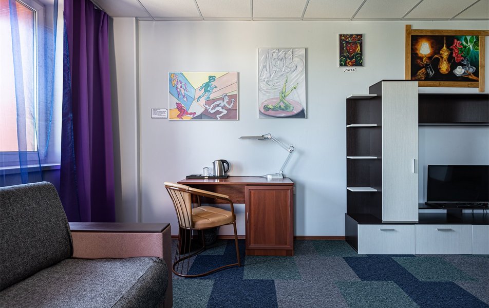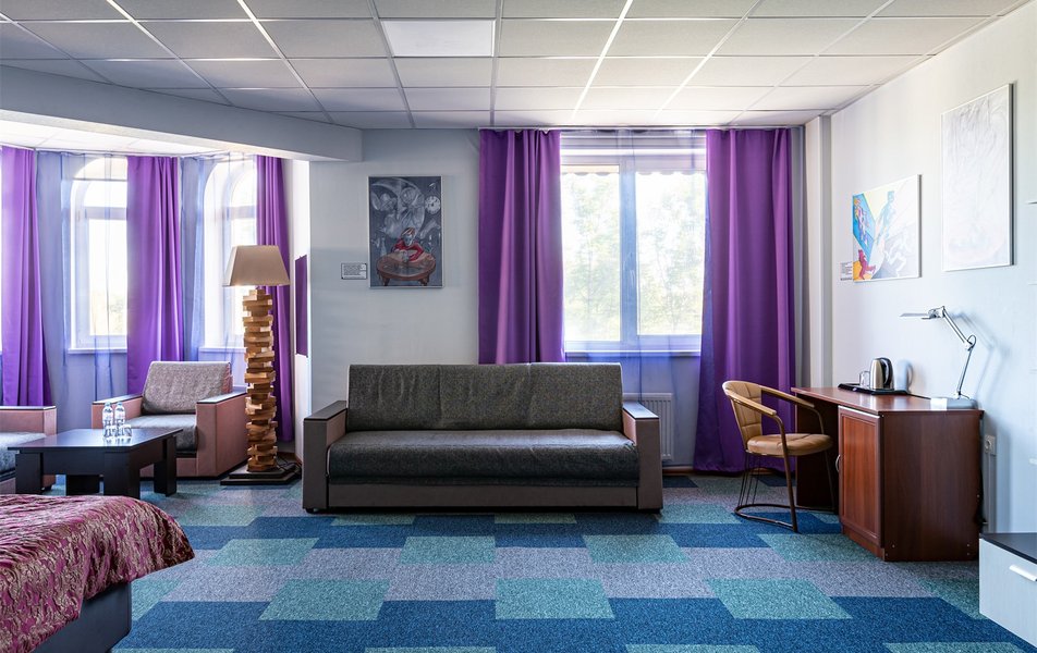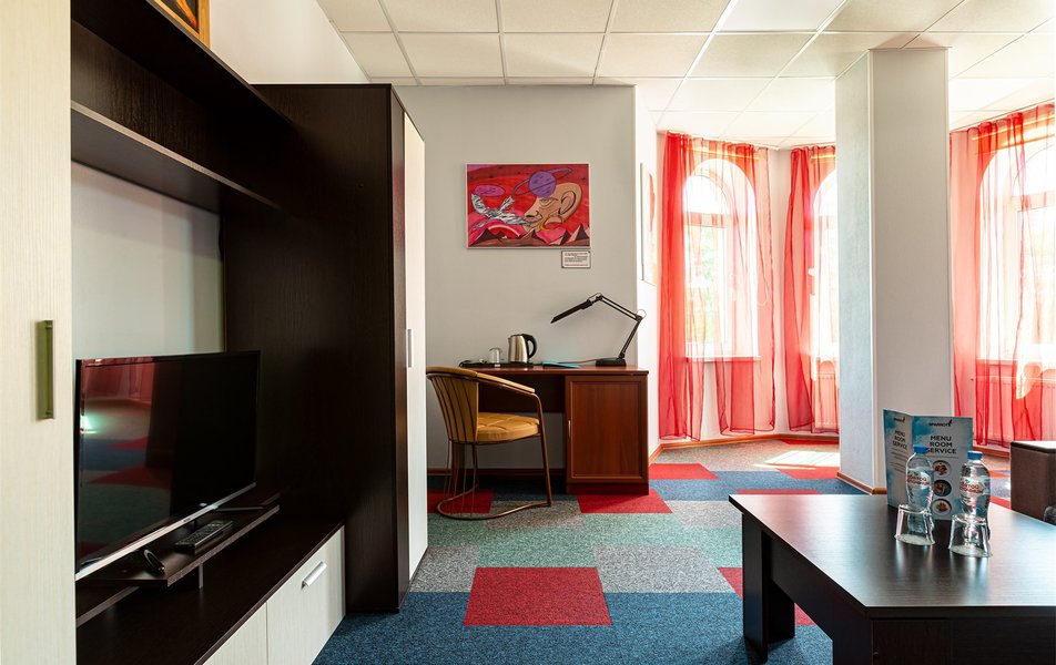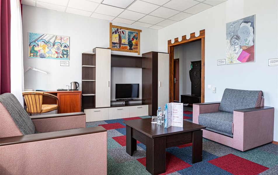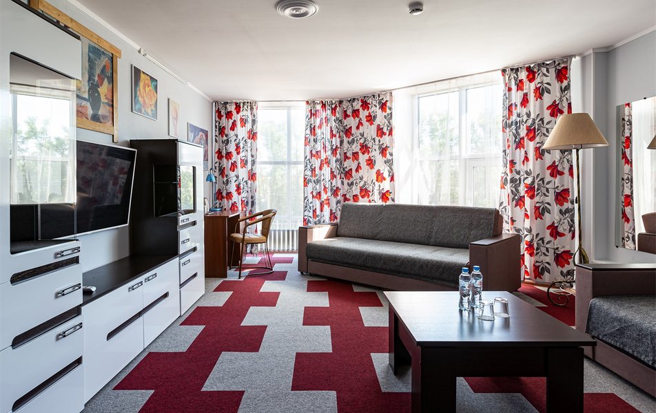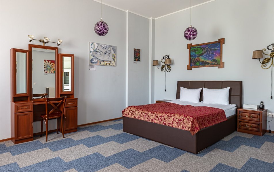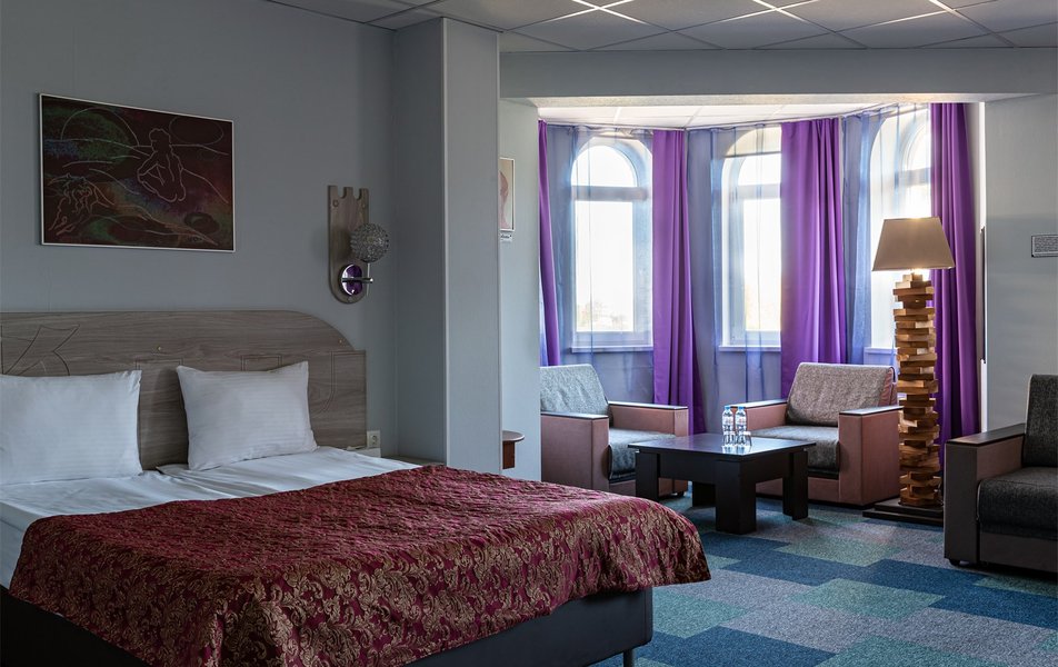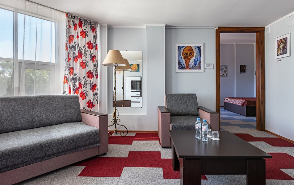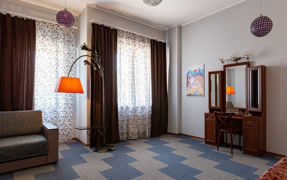 Люкс 2-местный 2-комнатный Количество комнат: 2-комнатный Тип номера: Люкс Кол-во основных мест: 2 Площадь (кв. м): 50 Мебель: зеркало, кресла, кровать двуспальная, прикроватные тумбочки, стол, стулья, шкаф Оборудование: кондиционер, мини-холодильник, сейф, телевизор, телефон, электрочайник Санузел: с душем, туалетные принадлежности, фен Сервис: Wi-Fi бесплатно, смена полотенец, смена постельного белья, уборка номера, услуги внутренней телефонной связи