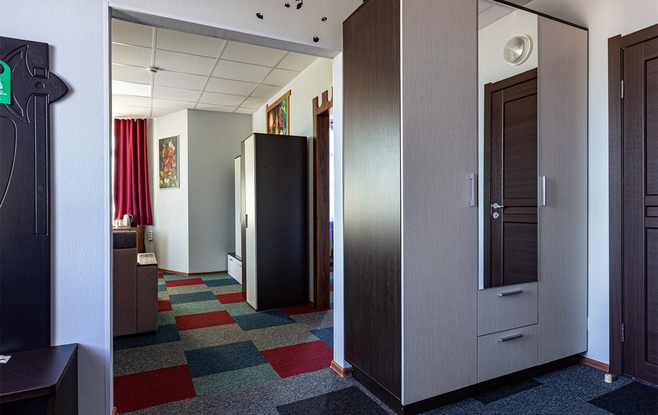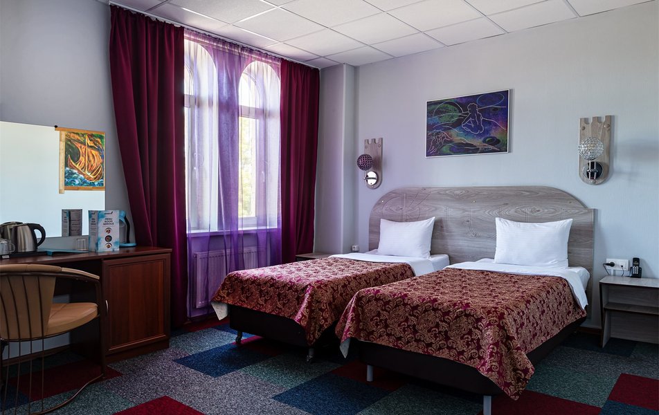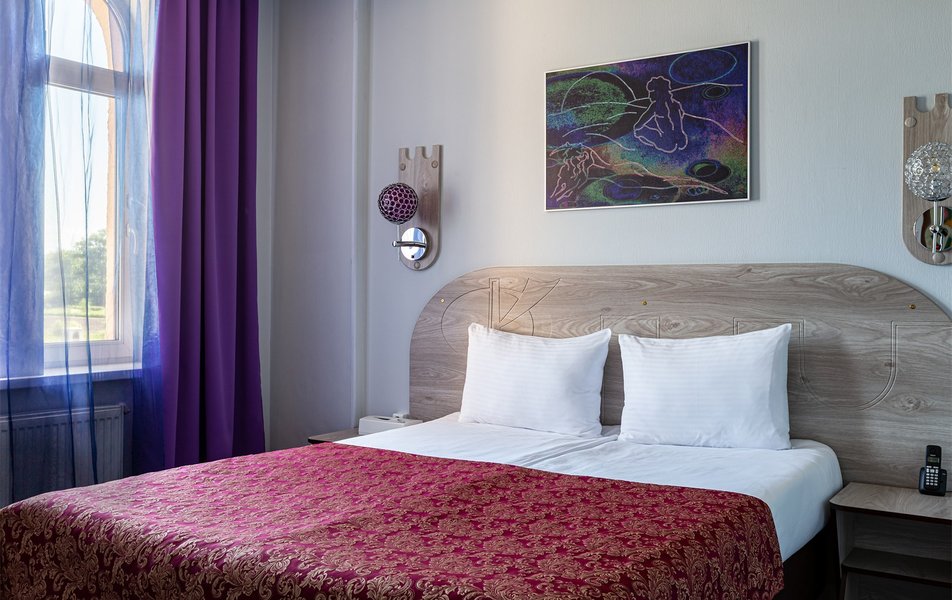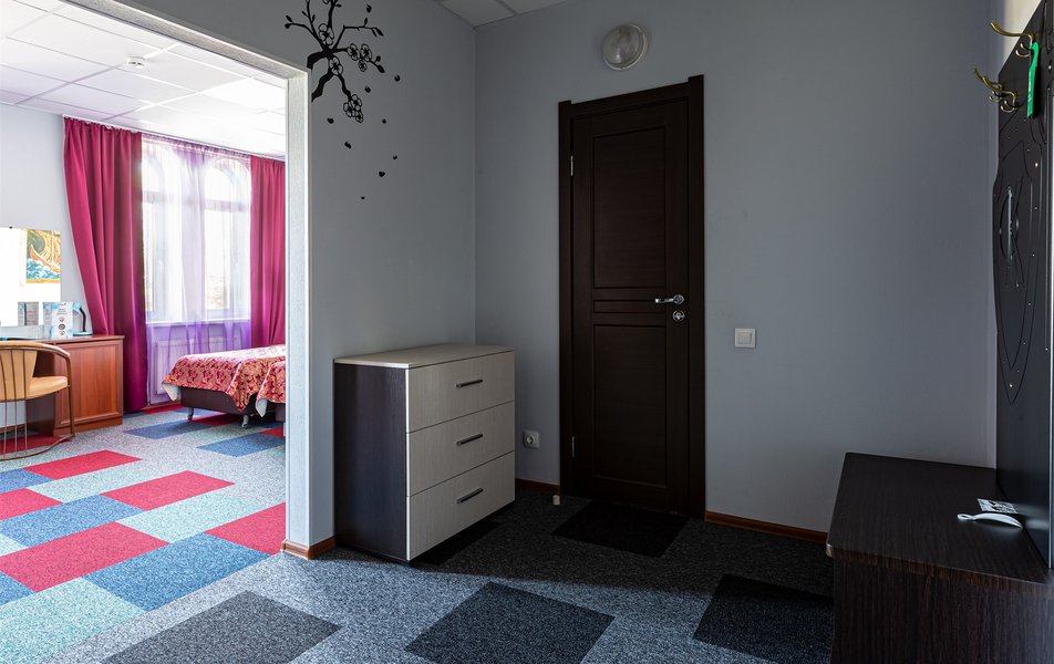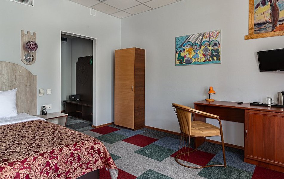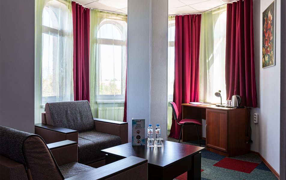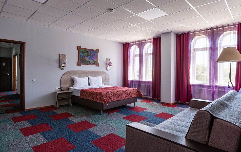 Люкс 2-местный 2-комнатный (Форт) Количество комнат: 2-комнатный Тип номера: Люкс Дополнительное место: диван Кол-во доп. мест: 1 Кол-во основных мест: 2 Площадь (кв. м): 64 Мебель: диван, зеркало, кровать двуспальная, прикроватные тумбочки, стол, стулья, шкаф Оборудование: кондиционер, мини-холодильник, сейф, телевизор, телефон, электрочайник Санузел: с душем, туалетные принадлежности, фен Сервис: Wi-Fi бесплатно, смена полотенец, смена постельного белья, уборка номера, услуги внутренней телефонной связи