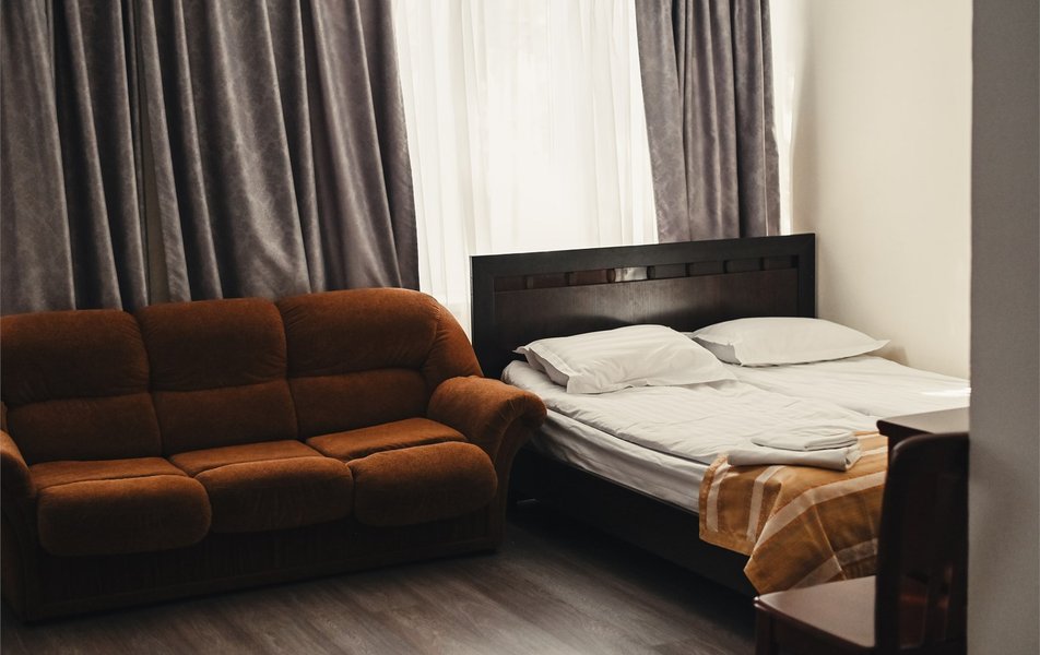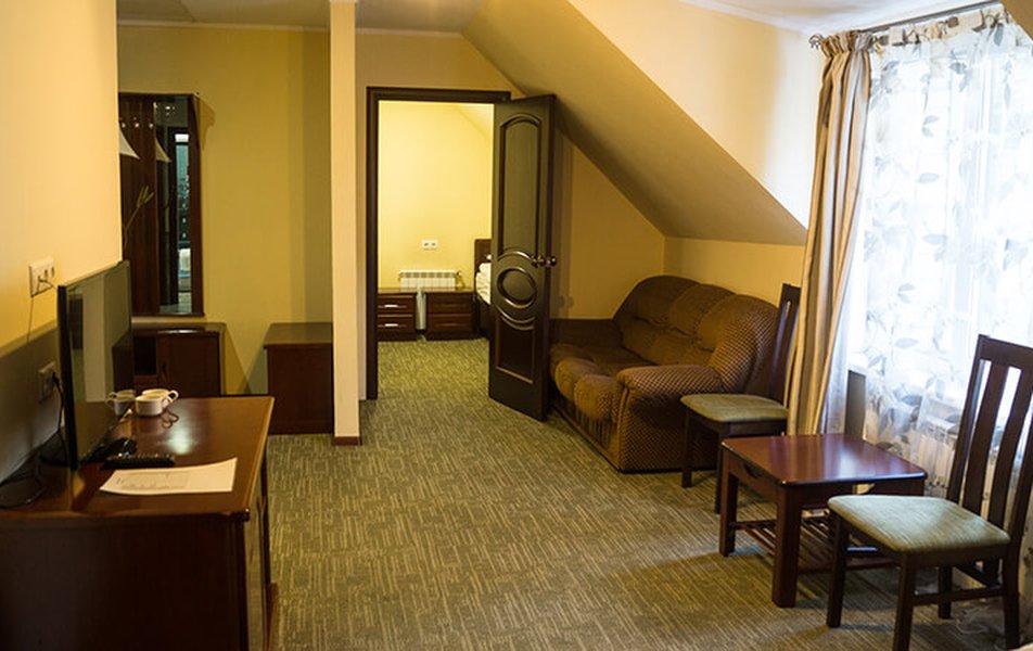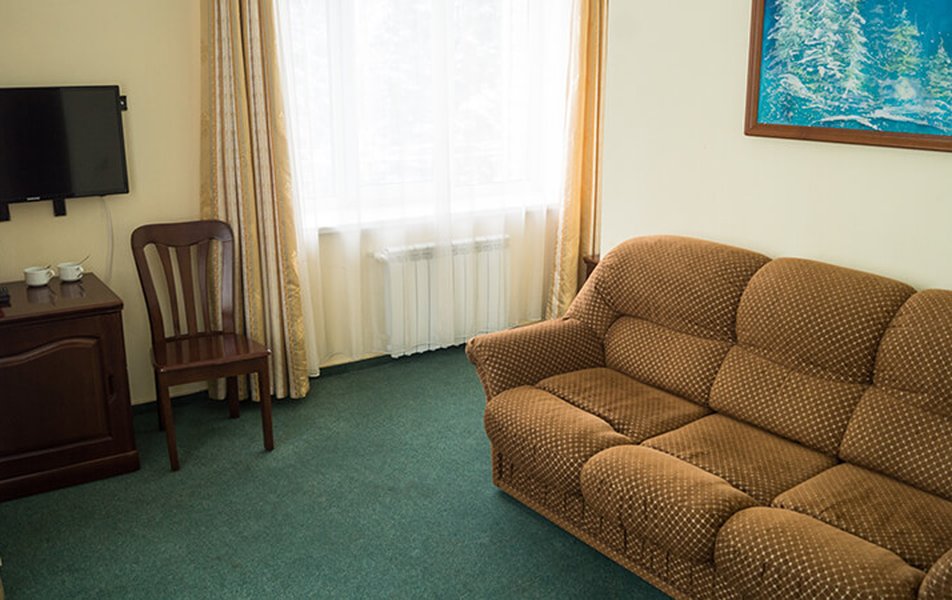 Полулюкс 2-местный Количество комнат: 2-комнатный Тип номера: Полулюкс Дополнительное место: раскладной диван Кол-во доп. мест: 2 Кол-во основных мест: 2 Площадь (кв. м): 36 Мебель: диван раскладной, кровати односпальные /одна двуспальная кровать, прикроватные тумбочки, стол, стулья, шкаф Оборудование: набор посуды, телевизор Санузел: с душевой кабиной, туалетные принадлежности Сервис: Wi-Fi бесплатно, смена полотенец, смена постельного белья, уборка номера