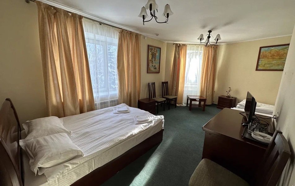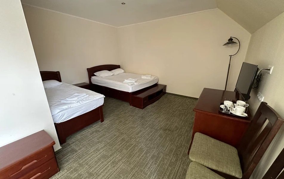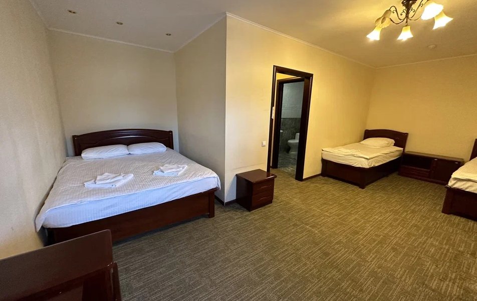 Полулюкс 2-местный (№31) Количество комнат: 2-комнатный Тип номера: Полулюкс Дополнительное место: диван и кровать Кол-во доп. мест: 4 Кол-во основных мест: 2 Площадь (кв. м): 38 Мебель: диван раскладной, кровати односпальные: 2 шт., кровать двуспальная, прикроватные тумбочки, стол, стулья, шкаф Оборудование: набор посуды, телевизор Санузел: с душевой кабиной, туалетные принадлежности Сервис: Wi-Fi бесплатно, смена полотенец, смена постельного белья, уборка номера